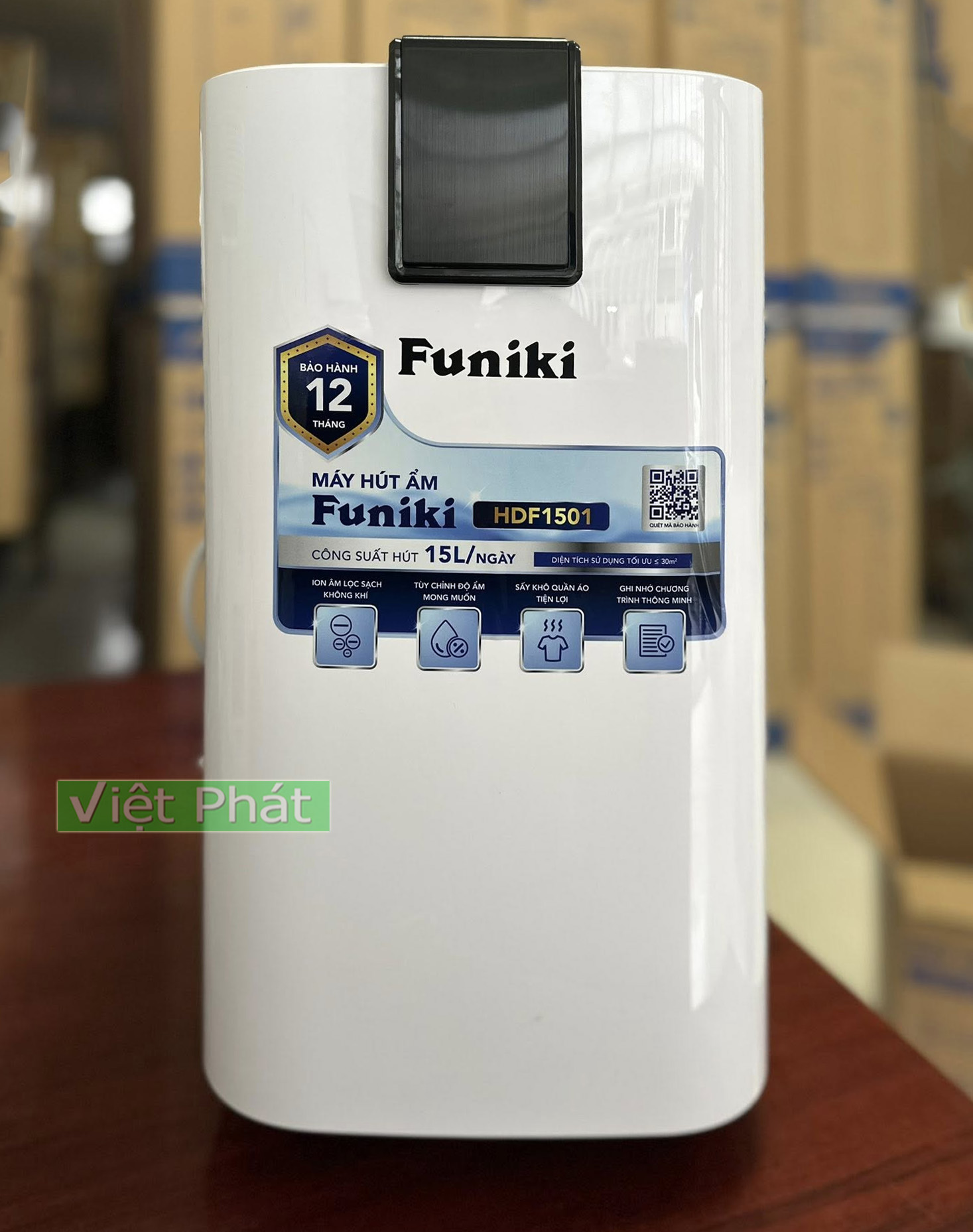 Máy hút ẩm Funiki HDF1501 của tập đoàn Hòa Phát là sản phẩm phù hợp cho phòng ≤ 30 m2 giúp giảm độ ẩm và cải thiện chất lượng không khí. Sản phẩm đặc biệt hữu ích trong mùa nồm ẩm làm giảm nguy cơ mốc đồ, hư hại thiết bị. Trong bối cảnh chất lượng không khí suy giảm, tính năng ion âm của máy hút ẩm Funiki giúp lọc sạch không khí, khử mùi, diệt khuẩn, nấm mốc và giảm các tác nhân gây dị ứng, được sử dụng cho các gia định có trẻ nhỏ hay bị viêm đường hô hấp, người già viêm mũi, dị ứng…